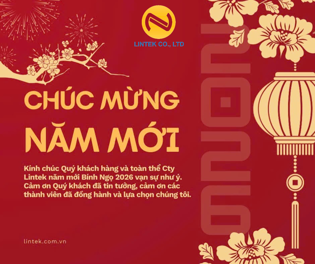 🧧Nhân dịp Xuân Bình Ngọ 2026, Ban Lãnh đạo Công ty Lintek xin gửi tới Quý Khách hàng, Quý Đối tác và toàn thể thành viên lời chúc năm mới An Khang – Thịnh Vượng – Vạn Sự Như Ý.